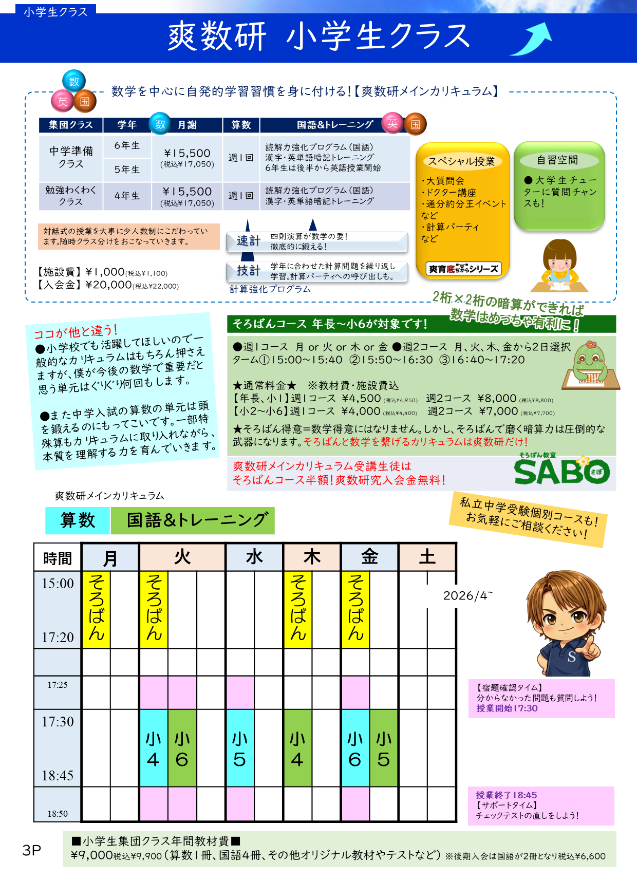 2026年4月からの時間割になります。2026年2,3月のスケジュールに関して、その学年は同じになります。詳しくはお問合せくださいませ。